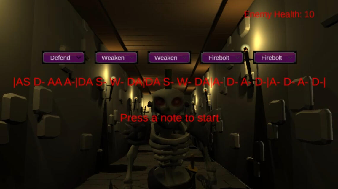 Drummage is a dungeon crawler featuring turn based rhythm combat. Working as part of a team of four, I designed and programmed the main combat system for the game.In combat, players plan each of their turns by selecting a pattern of spells to cast, each with their own unique set of inputs. After choosing their set of spells, players begin the music. While the music plays, the player must perform each spell's set of inputs in rhythm to the beat of the music to cast them.