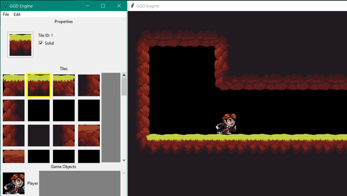 The GGD Engine is a 2D game engine designed to be used with Python. It was written using C++, and then bound into a Python Library using Pybind, as part of a four-person team. My teammate and I's role in the project was developing the component system that served as the backbone of the engine.The engine supported a number of different components that could be added to GameObjects for tasks such as sprite rendering, tile mapping, sound, physics and collisions.